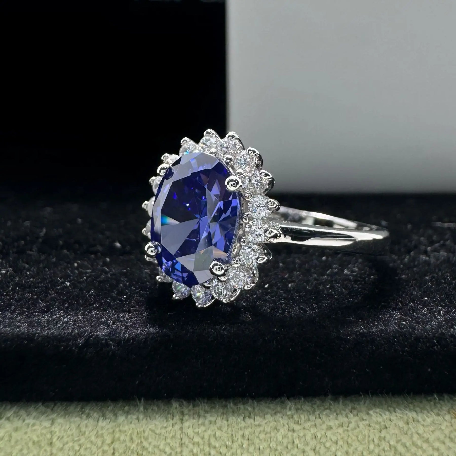 The Elysanne Royale Halo ring features a captivating oval sapphire centerpiece surrounded by a shimmering halo of brilliant crystal accents. A design inspired by classic royal jewellery, crafted to bring a touch of timeless majesty to every moment.
